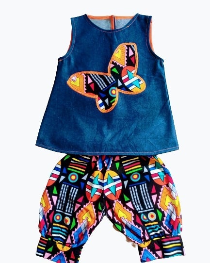 Girls’ shorts with matching denim top. Made with quality Ankara; the blue denim top features a colorful butterfly motif and a button at the back. Ankara shorts features an elastic band for easy fitting.