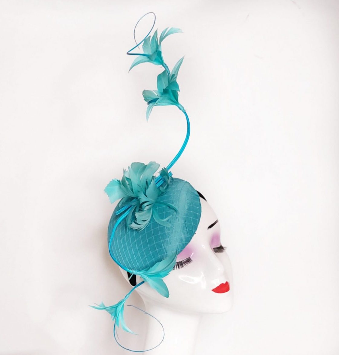 Small base fascinator wrapped with shiny fabric and Russian veiling. Base is accessorised with feathers.